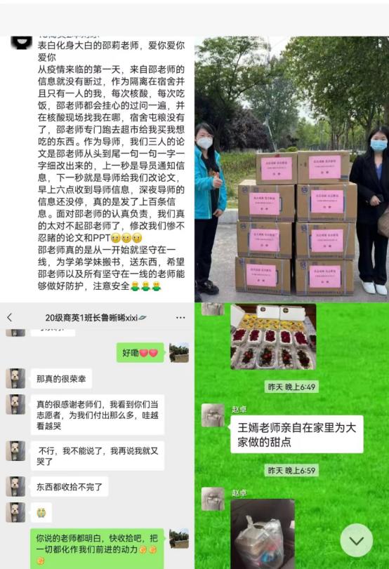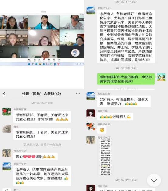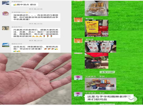 公司的老师们也成立“一对一帮扶”小组群,在群里安抚每一位隔离的员工,有的老师不顾各种危险多次往返校园给一线抗疫老师送去补给,有的老师联系企业为学院师生提供防控物资捐助,有的老师因为管控等原因不能到一线,主动为学院的师生捐物捐款,有的老师在家亲手做出各种美食甜点,慰问一线的防控英雄,也有的老师用温暖的文字和视频为大家打气加油……。球速体育(国际教育学院)的群里充满着满满的爱意。